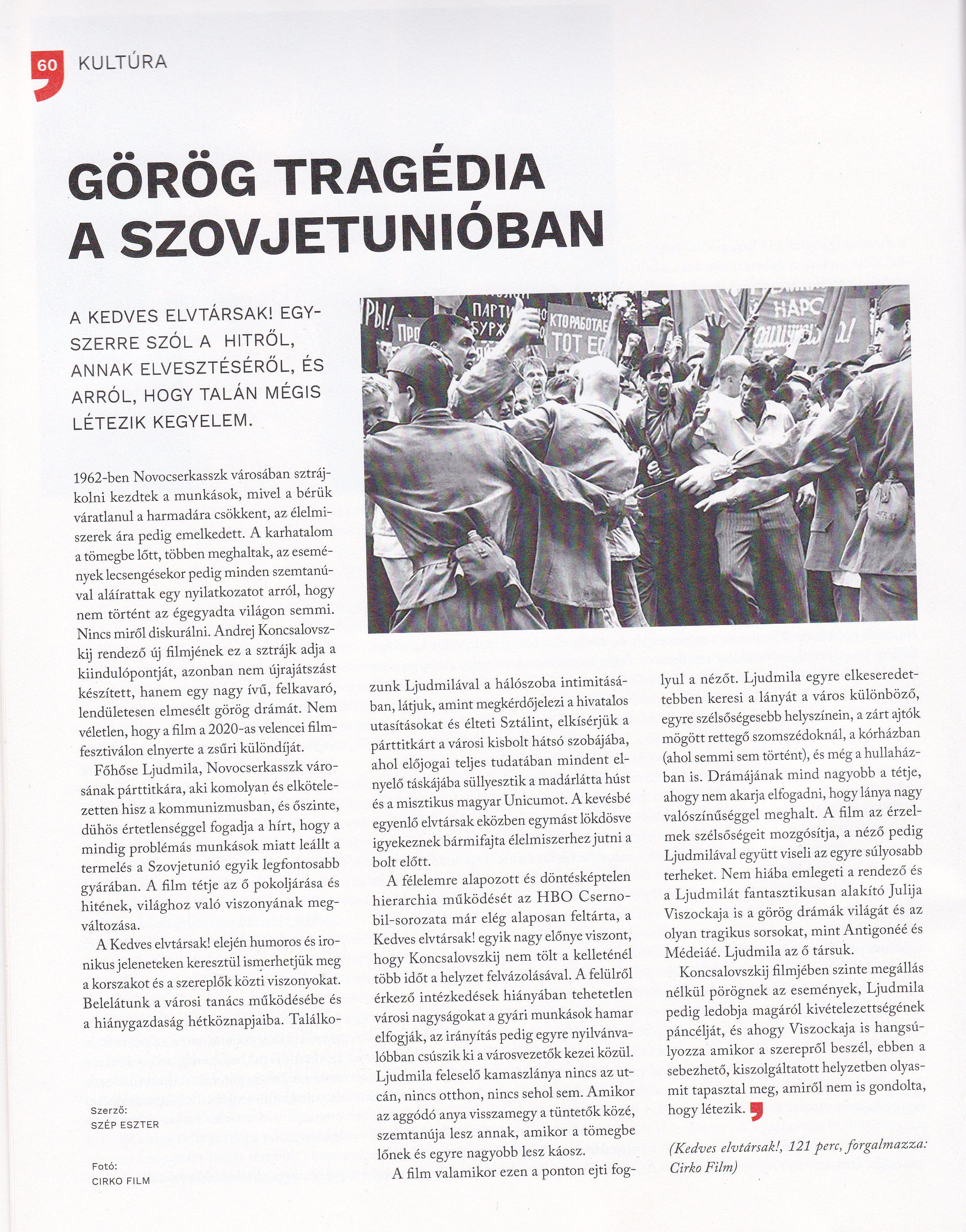 “Görög tragédia a Szovjetúnióban” [A Kedves elvtársak! című filmről] 168 óra, 2021/38. p.60.