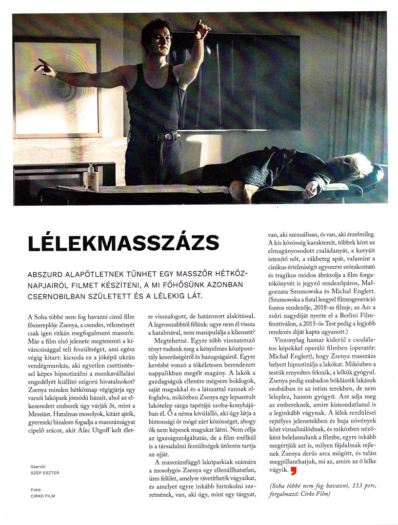 “Lélekmasszázs” [Malgorzata Szumowska: Soha többé nem fog havazni című filmjéről] 168 óra, 2021/41, p. 58.