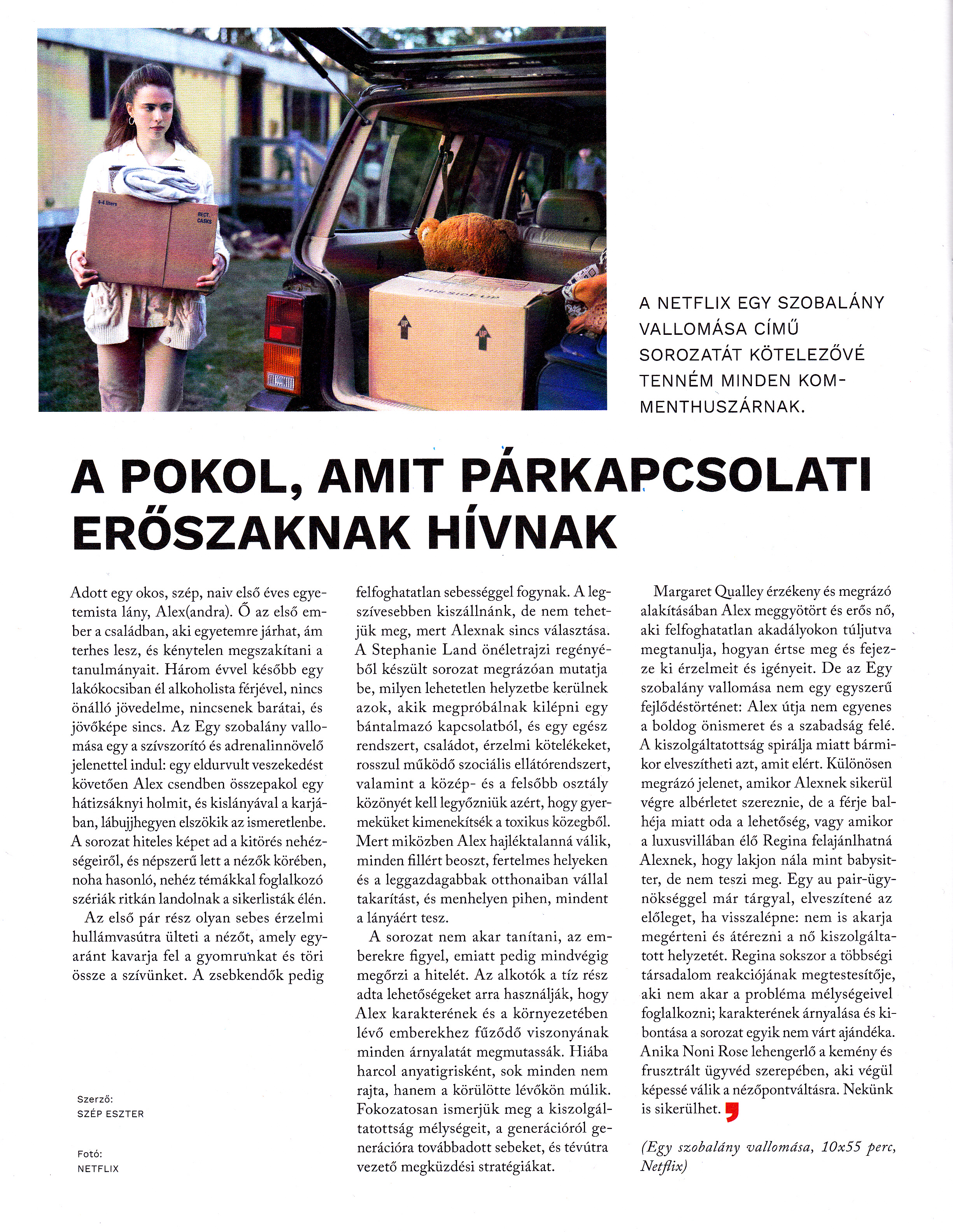 “A pokol, amit párkapcsolati erőszaknak hívnak” [Az Egy szobalány vallomása (Maid) c. sorozatról] 168 óra, 2021/45, 54.