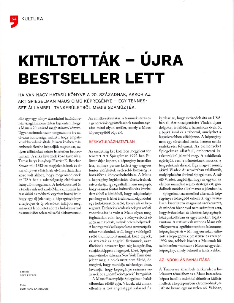 Felkértek, hogy írjak Art Spiegelmna Maus című képregényének jelentőségéről a Tennessee tankerületben történt tiltás apropóján. Az írás a 168 óra 2022. február 3-i számában jelent meg az 54-55. oldalon. A képekre kattintással nagyíthatók.